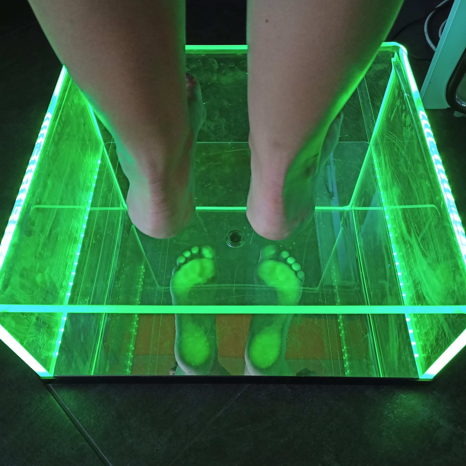Podoskop je přístroj se skleněnou deskou, pod kterou je umístěno zrcadlo, kamera a polarizované světlo. Díky tomu získáváme digitální obraz otisků nohou. Výška přístroje je jen 20cm, tudíž na něj bez potíží vystoupí děti i jedinci s horší pohyblivostí. Fyzioterapeut sleduje zatížení chodidel, tvarování klenby nebo postavení pat ve statické i dynamické pozici. Vyšetření probíhá ve stoji na obou nohách, na jedné noze a na špičkách. Jednotlivá vyšetření můžeme ukládat do počítače. Tím nám vzniká možnost sledovat změny v průběhu času. Vyšetření je časově nenáročné, pro vyšetřovaného nezatěžující a pro terapeuta velmi přínosné pro správnou diagnostiku a následnou terapii. Podoskop nám pomáhá při diagnostice ploché nohy, vbočených kotníků nebo vadného držení těla. Sledujeme totiž nejen postavení nohou, ale i reakce pánve či páteře.